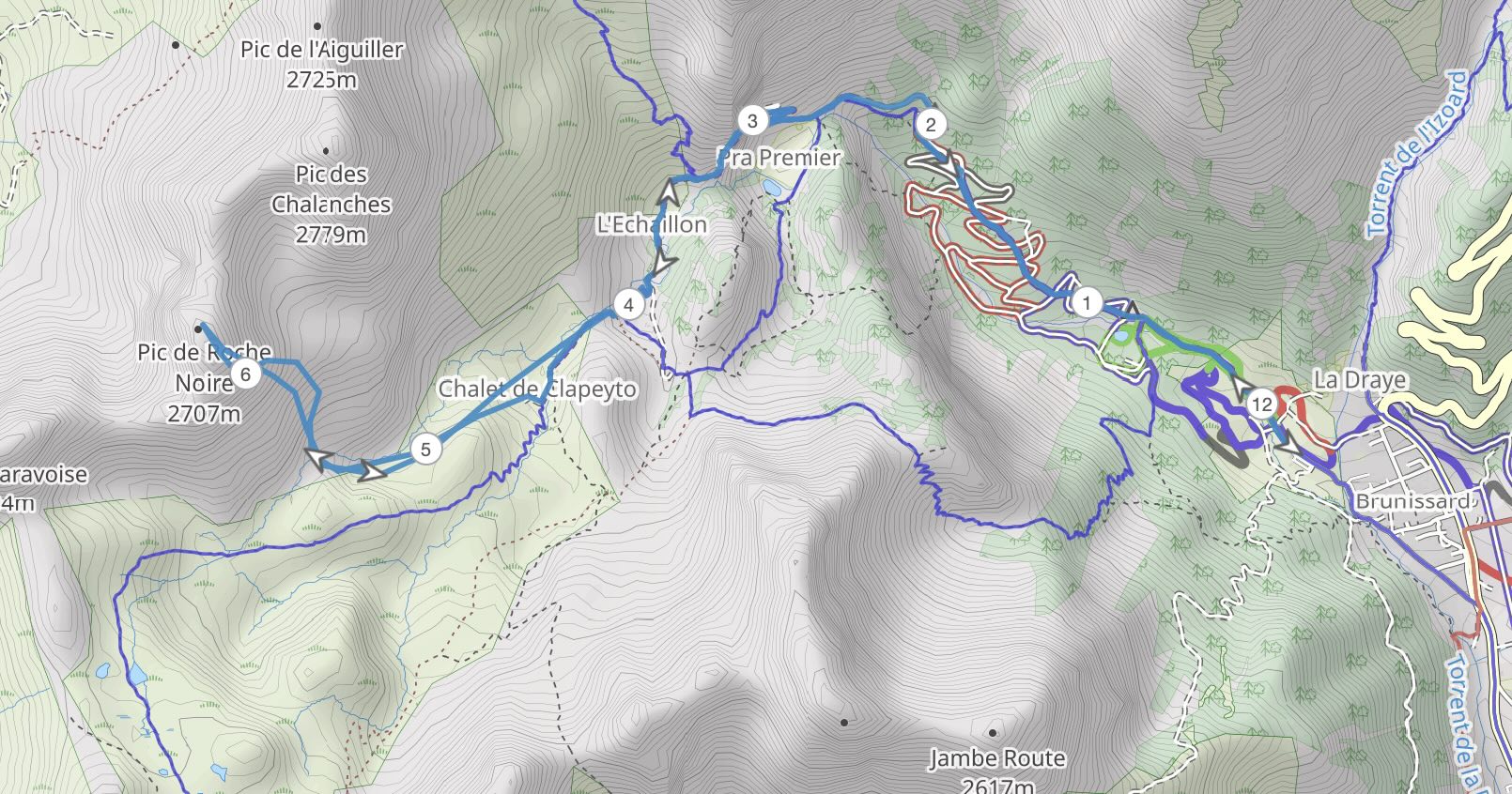 The parking is at at the Brunissard ski du fond station. Follow the ski du fond track North West,and then follow the road to the hamlet of Drataya. From here you head west then SW in to a small valley (torrent des Grisons du Sellar). Once through the tight part of the valley head north and climb towards the pic de Roche Noire. The SE couloir is obvious, climb it to the top.